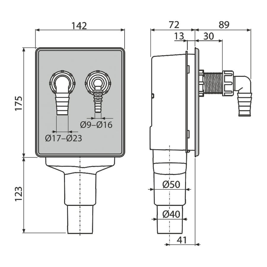 Сифон для стиральной машины Alcaplast под штукатурку для подключения до двух устройств DN40 и DN50, нержавеющая сталь (APS6)
