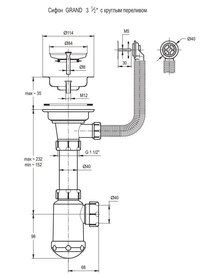 Сифон Санпласт GRAND 3 1/2" х 40 СН 370-15-01 предназначен для установки на каменные и нержавеющие кухонные мойки с диаметром сливного отверстия 90 мм (3 1/2") и круглым, либо прямоугольным переливом.