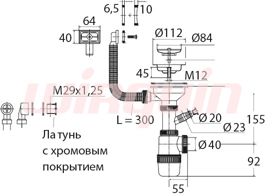 Сифон Wirquin Эконом 3 1/2"*40 L300 мм, 2 перелива прямоугольный, круглый с отводом Virplas (30987109)
