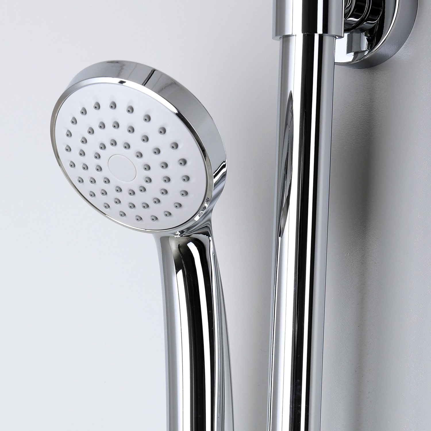 Душевой комплект А12202 легко монтируется к стене c помощью двух эксцентриков (подключение смесителя) и одного крепежного элемента (крепление стойки для душа к стене).