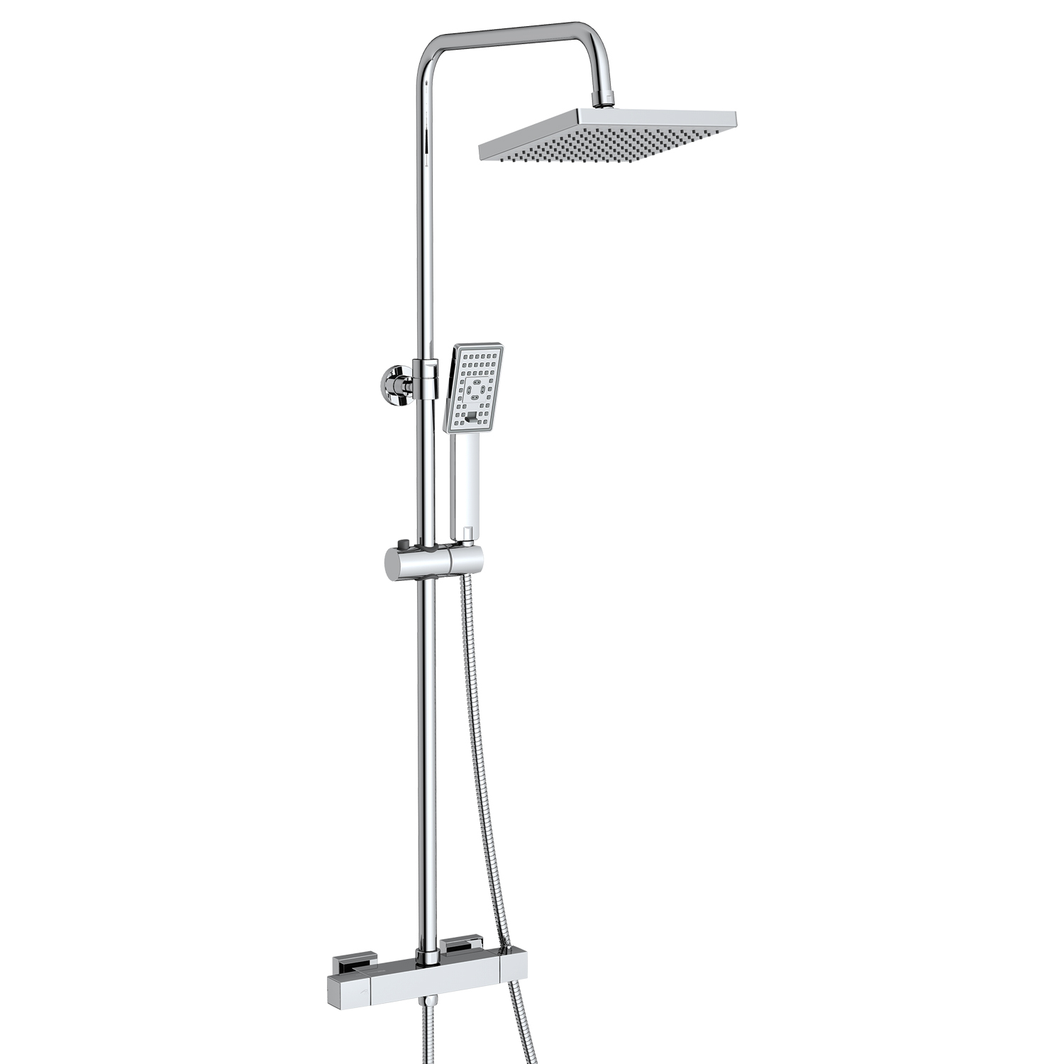 Стойку для душа А15502 Thermo можно регулировать по высоте. Для этого необходимо выдвинуть верхнюю часть стойки и зафиксировать на необходимой Вам высоте при помощи гайки верхнего крепления.