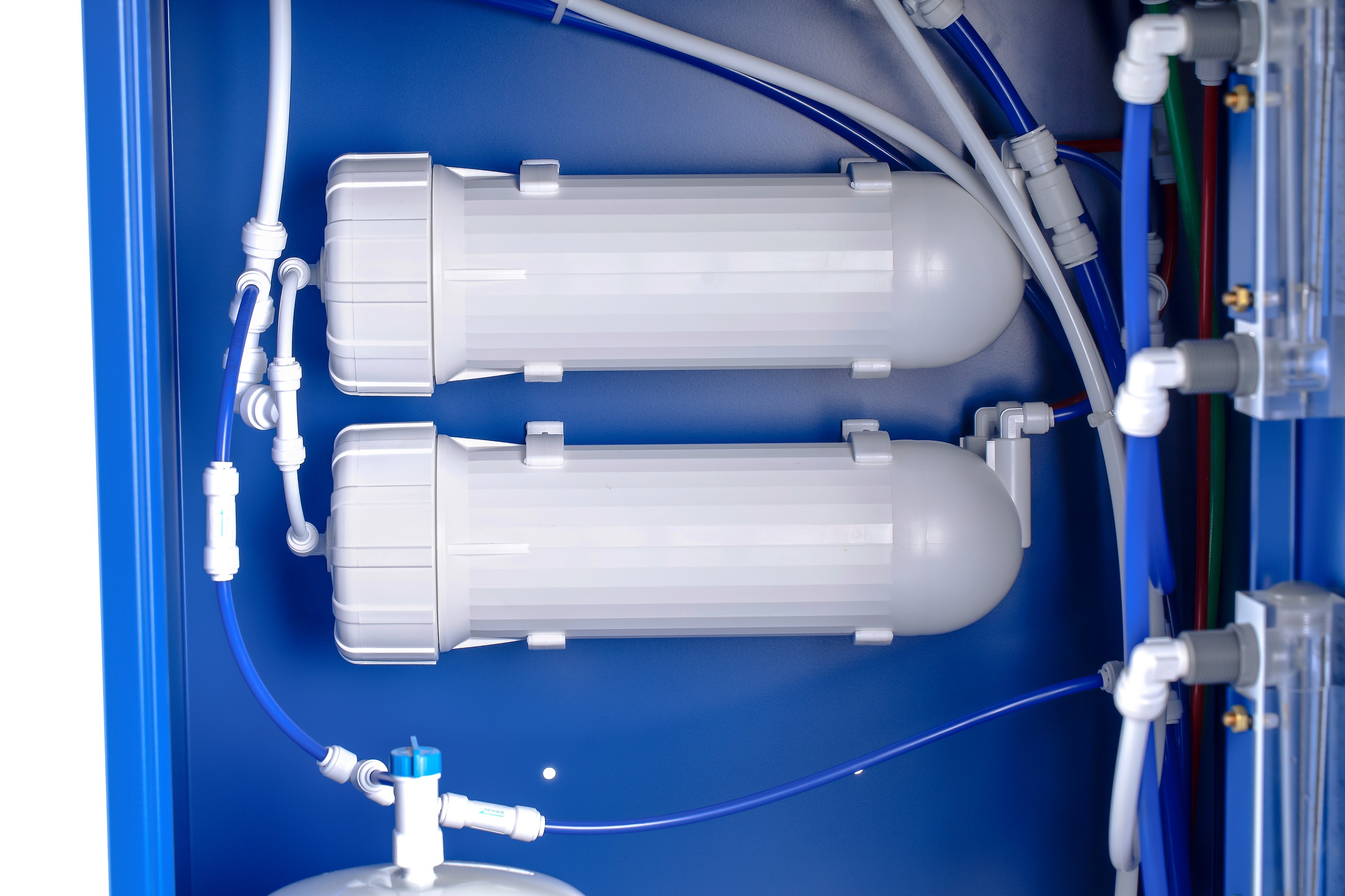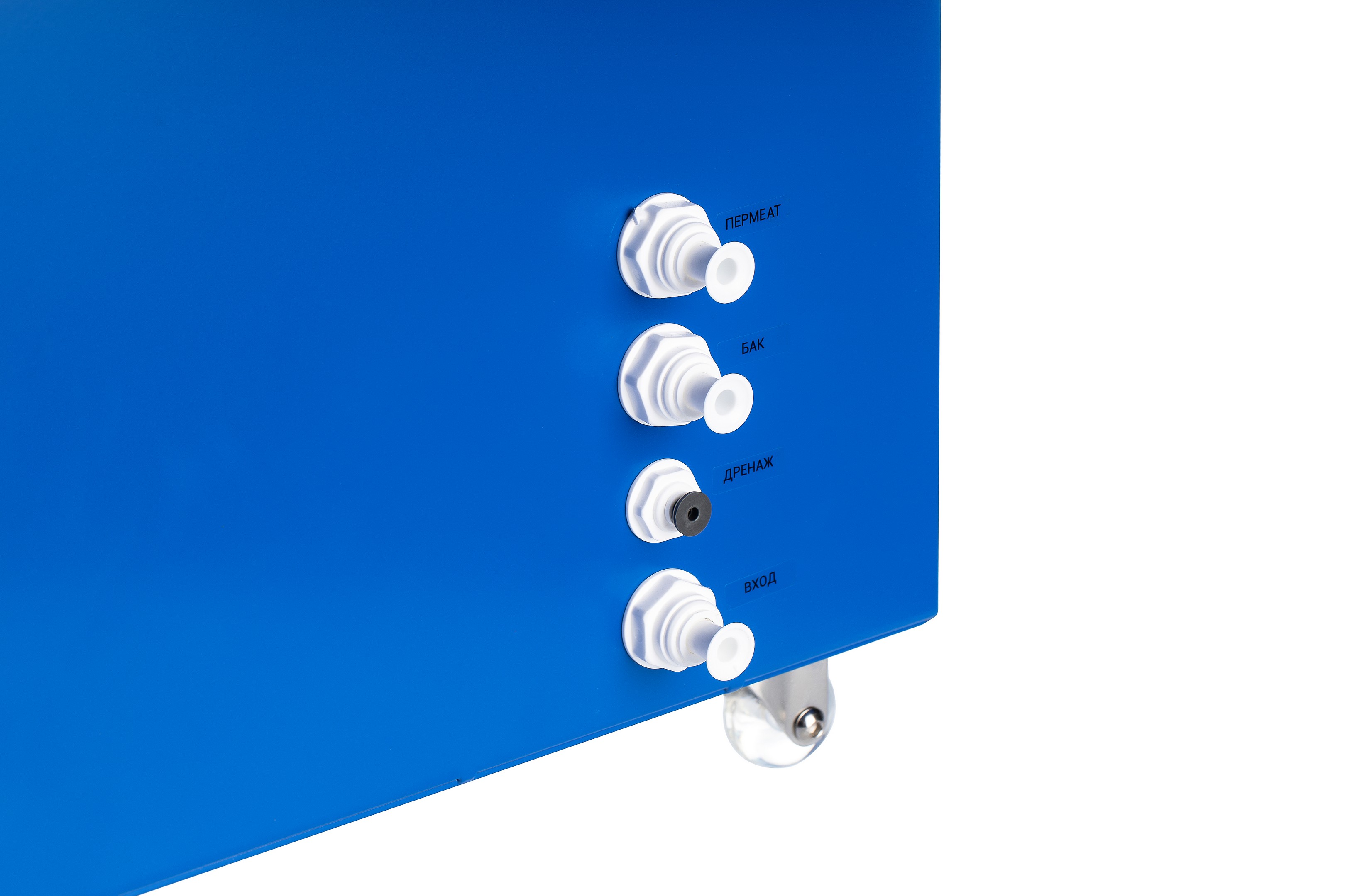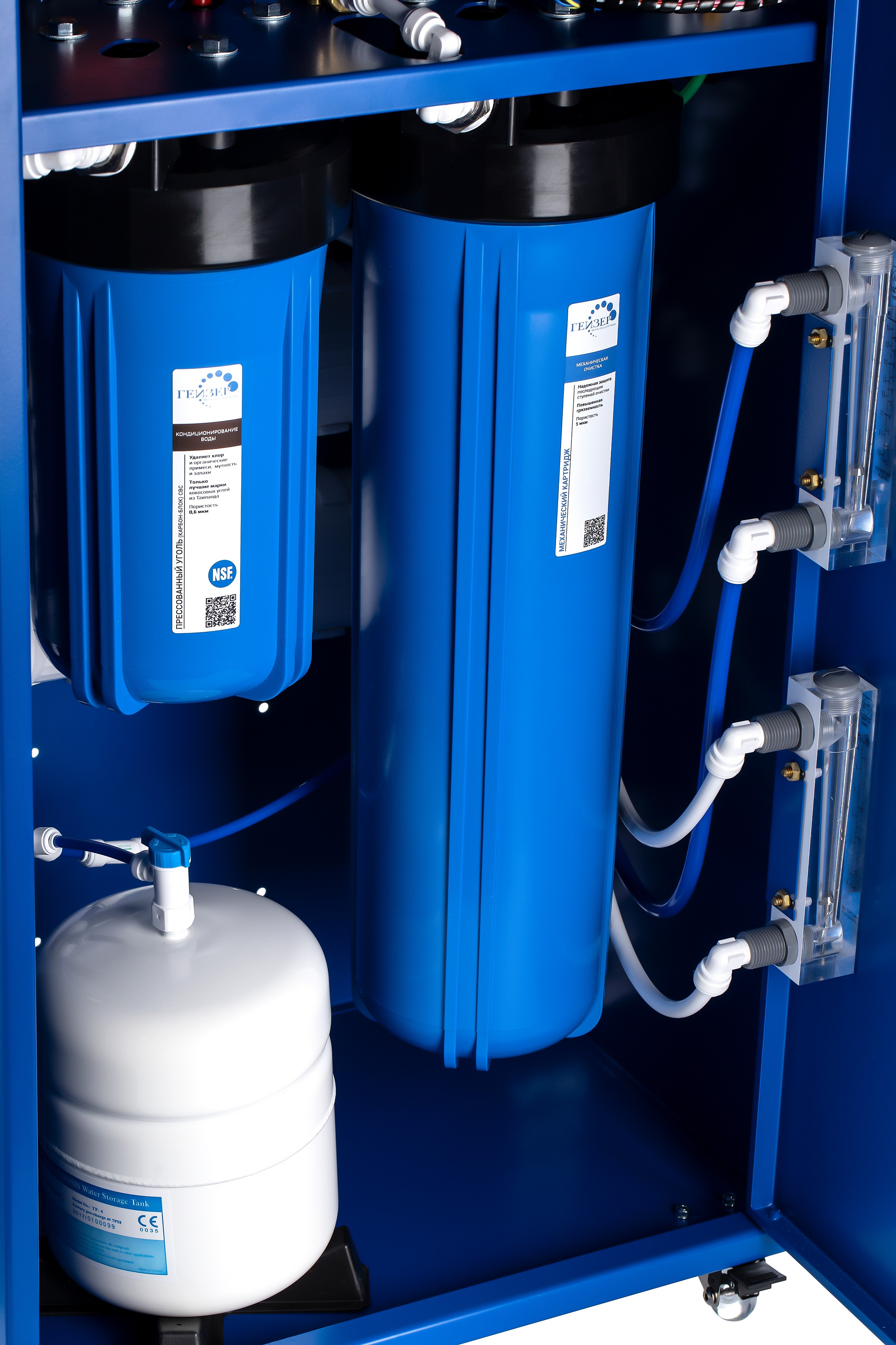 II ступень — обратноосмотическая мембрана для глубокой очистки воды. Сквозь поры мембран 0,0001 мкм проходят только молекулы воды, поэтому эффективность очистки достигает 99,9%
