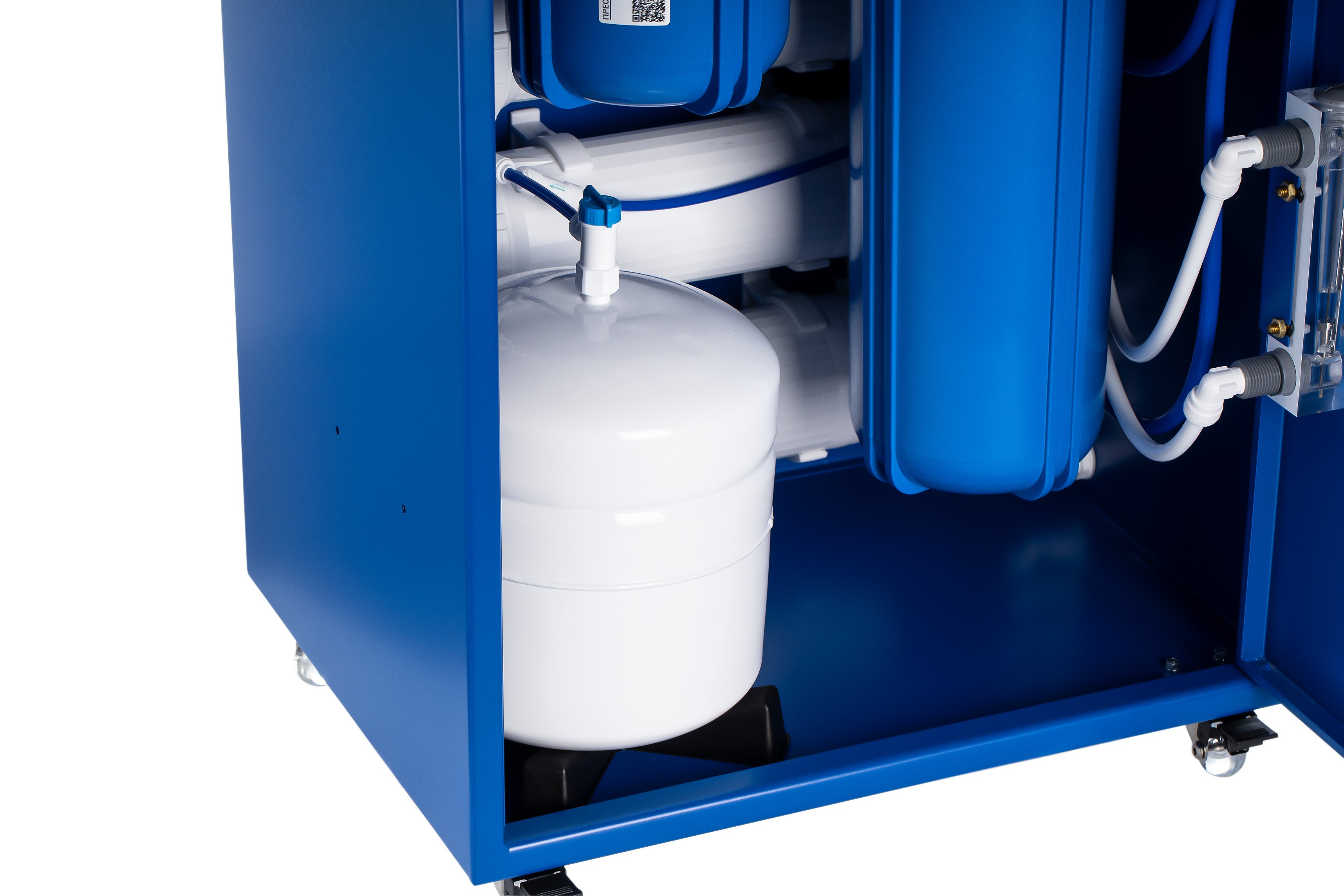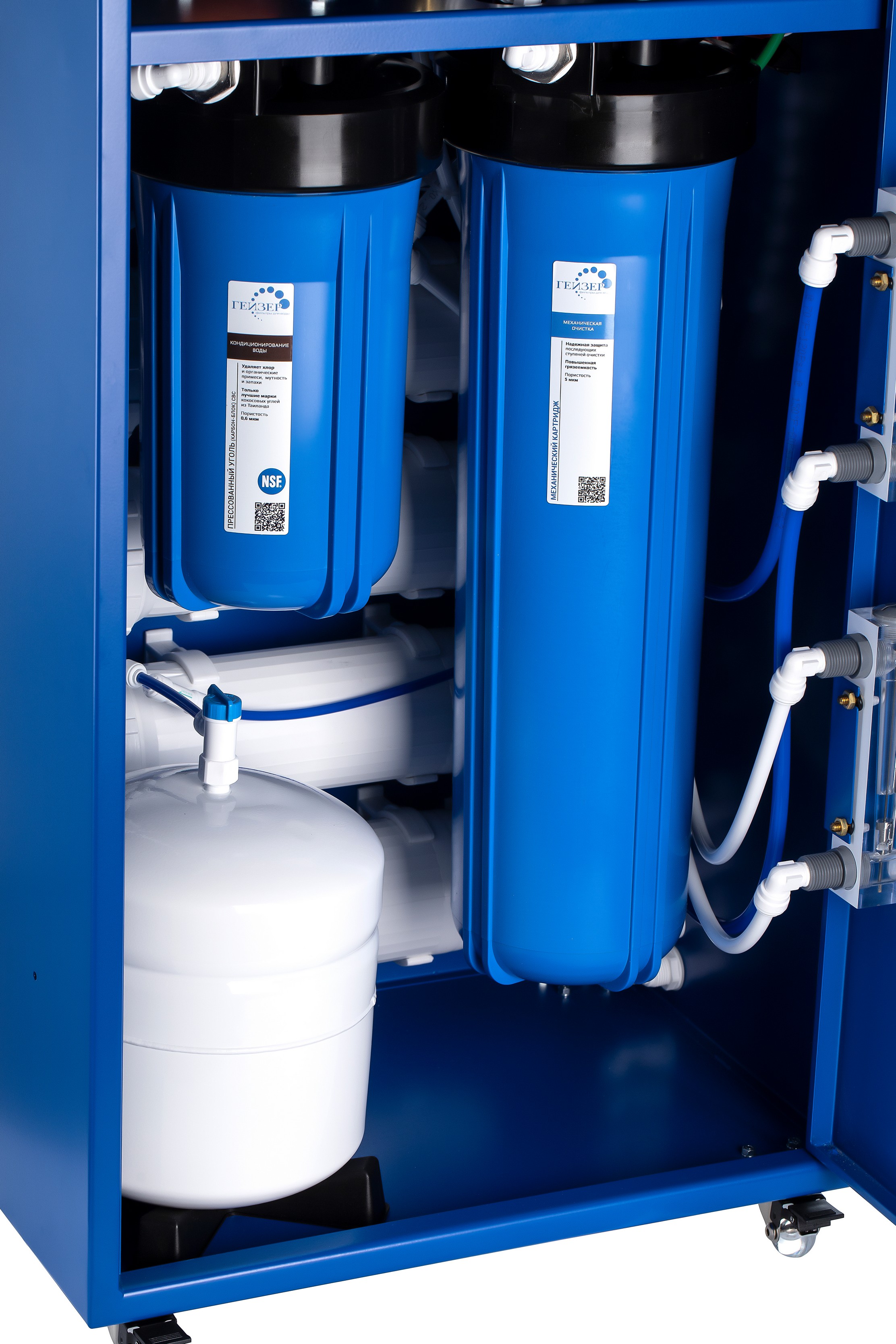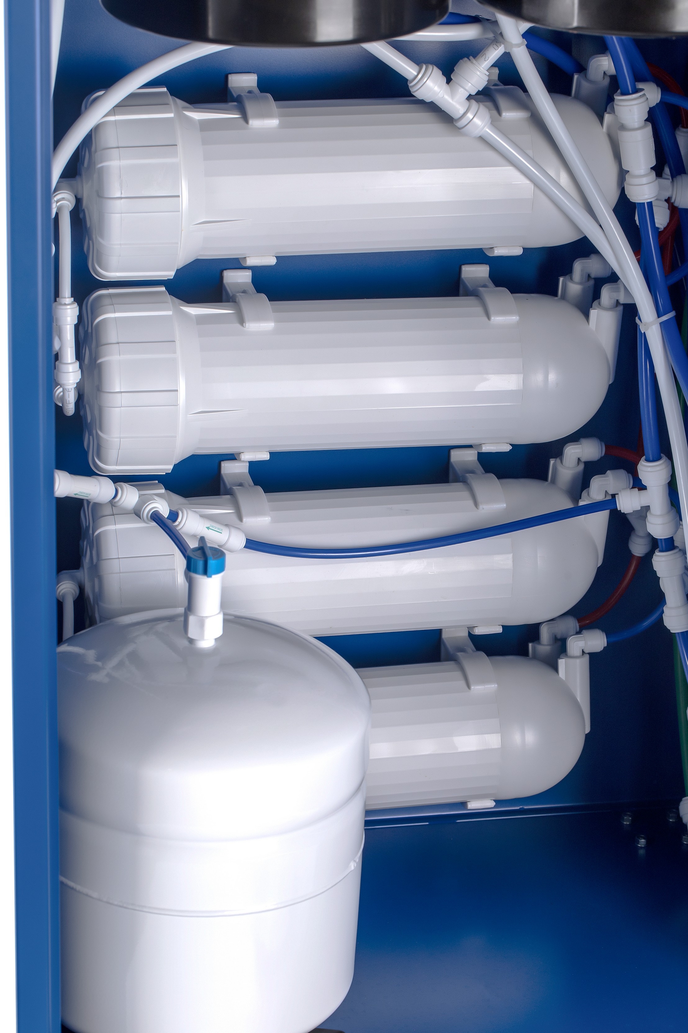 II ступень — обратноосмотическая мембрана для глубокой очистки воды. Сквозь поры мембран 0,0001 мкм проходят только молекулы воды, поэтому эффективность очистки достигает 99,9%