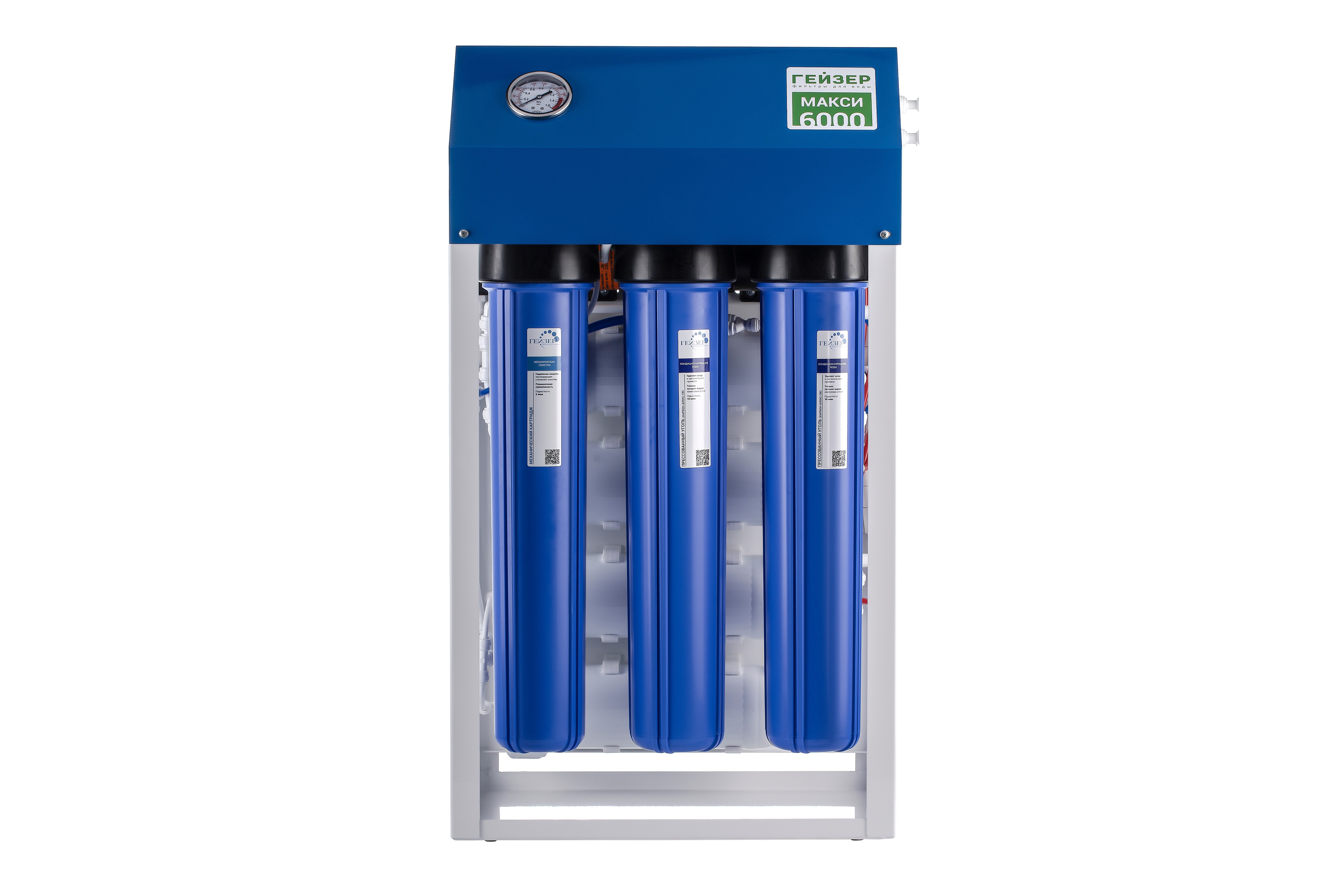 Гейзер Престиж Макси - это система для очистки воды повышенной производительностью, которая может быть использована как в быту, так и в небольших предприятиях общепита, кафе, мини-садах и прочее. Система эффективно очищает воду от механических примесей, органических и хлорорганических соединений, бактерий, вирусов, солей жесткости, растворенного и коллоидного железа и др., устраняет привкусы, запахи и цветность воды. Фильтрация воды происходит через полупроницаемую мембрану, поры которой пропускают только молекулы воды и кислорода. Так как размер молекул большинства примесей, бактерий и вирусов значительно больше молекул воды, мембрана успешно задерживает их, она также отлично справляется с водой повышенной жесткости. В фильтре используется трехступенчатая предварительная очистка воды. Данное оборудование широко применяется на предприятиях общественного питания. Данная установка отличается сочетанием компактности и высокой производительности, быстротой и легкостью подключения благодаря монтажному блоку с быстросъемными соединениями. В зависимости от модификации Гейзер Престиж Макси имеет 1/2/3/4 мембраны, соответственно моделям Гейзер Престиж Макси 1500/3000/4500/6000. Ступени очистки Престиж Макси: