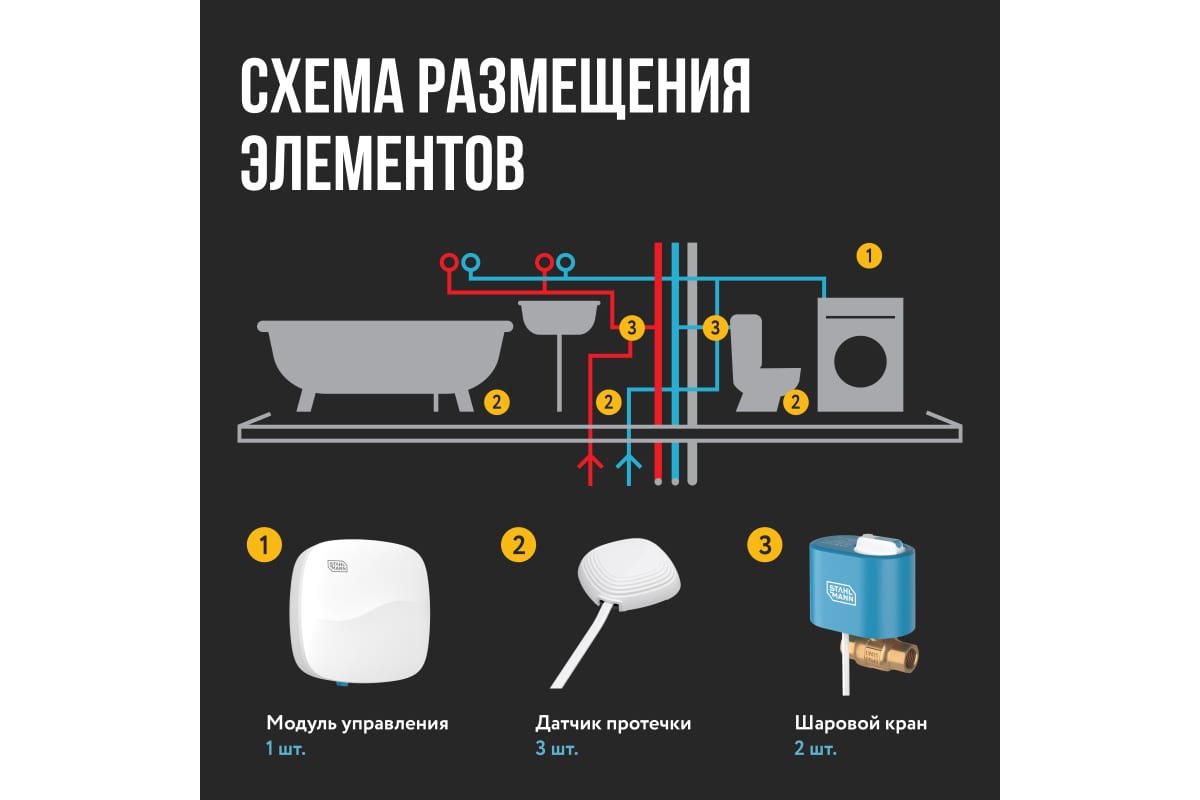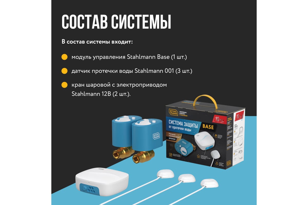 Комплектация: Модуль управления Stahlmann Base (1 шт.), датчик протечки воды Stahlmann 001 (3 шт.), кран шаровой 3/4 с электроприводом Stahlmann 12В (2 шт.).
