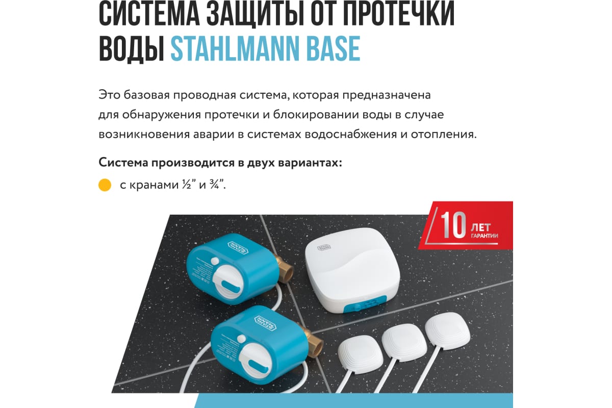Система защиты от протечки воды Stahlmann Base 1/2- это высокотехнологичная техника, которая станет незаменимым помощником не только в городской квартире, но и на даче.