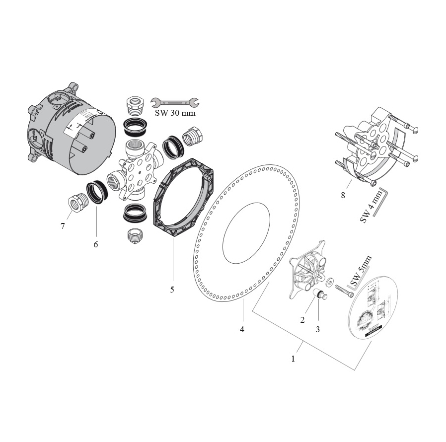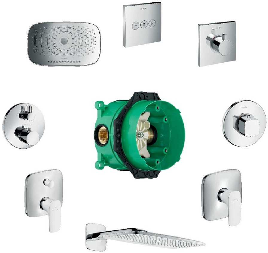 Дополнительная комплектация: Подходит ко всем смесителям для ванны и душа, ко всем наружным частям термостатов марки Hansgrohe.