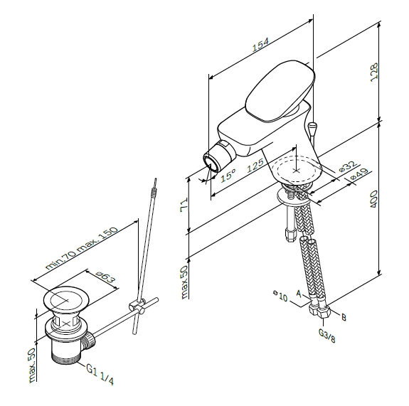 Состав поставки: смеситель, гибкая подводка, донный клапан