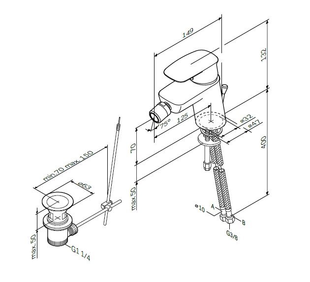 Состав поставки: смеситель, гибкая подводка, донный клапан