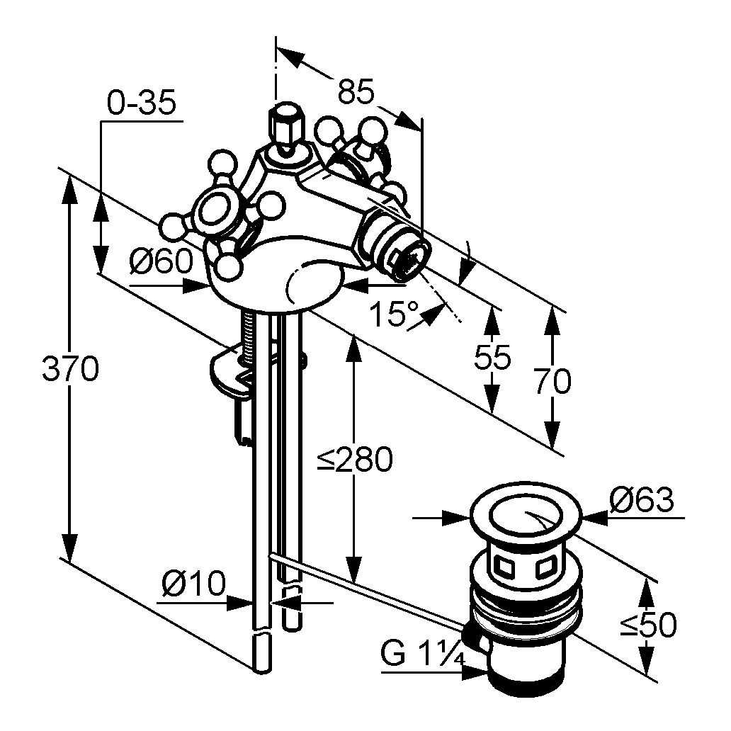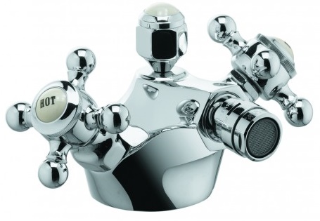 Смеситель для биде DN 8: крестообразные рукоятки, монтаж на одно отверстие, класс расхода воды А, каскадный аэратор на шаровом шарнире M 24 x 1, керамическая кран-букса 180°, донный клапан G 1 1/4, медные трубки 10 мм.