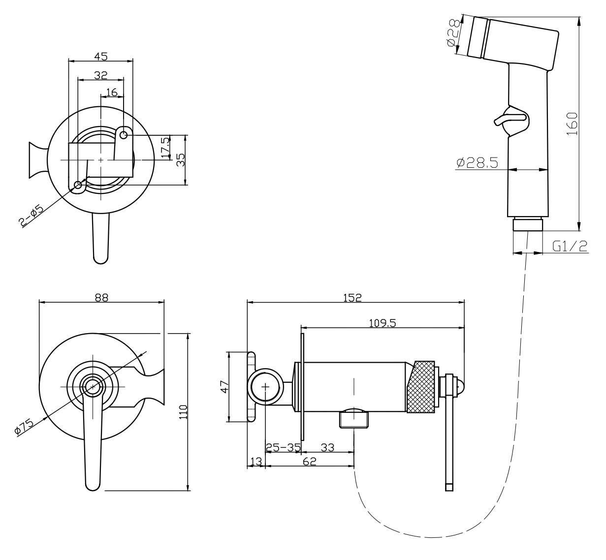В комплекте: гиг. лейка, металлический держатель, пластиковая вставка держателя, шланг, металлический отражатель, штуцер на шланг, шестигранник,онтажный комплект