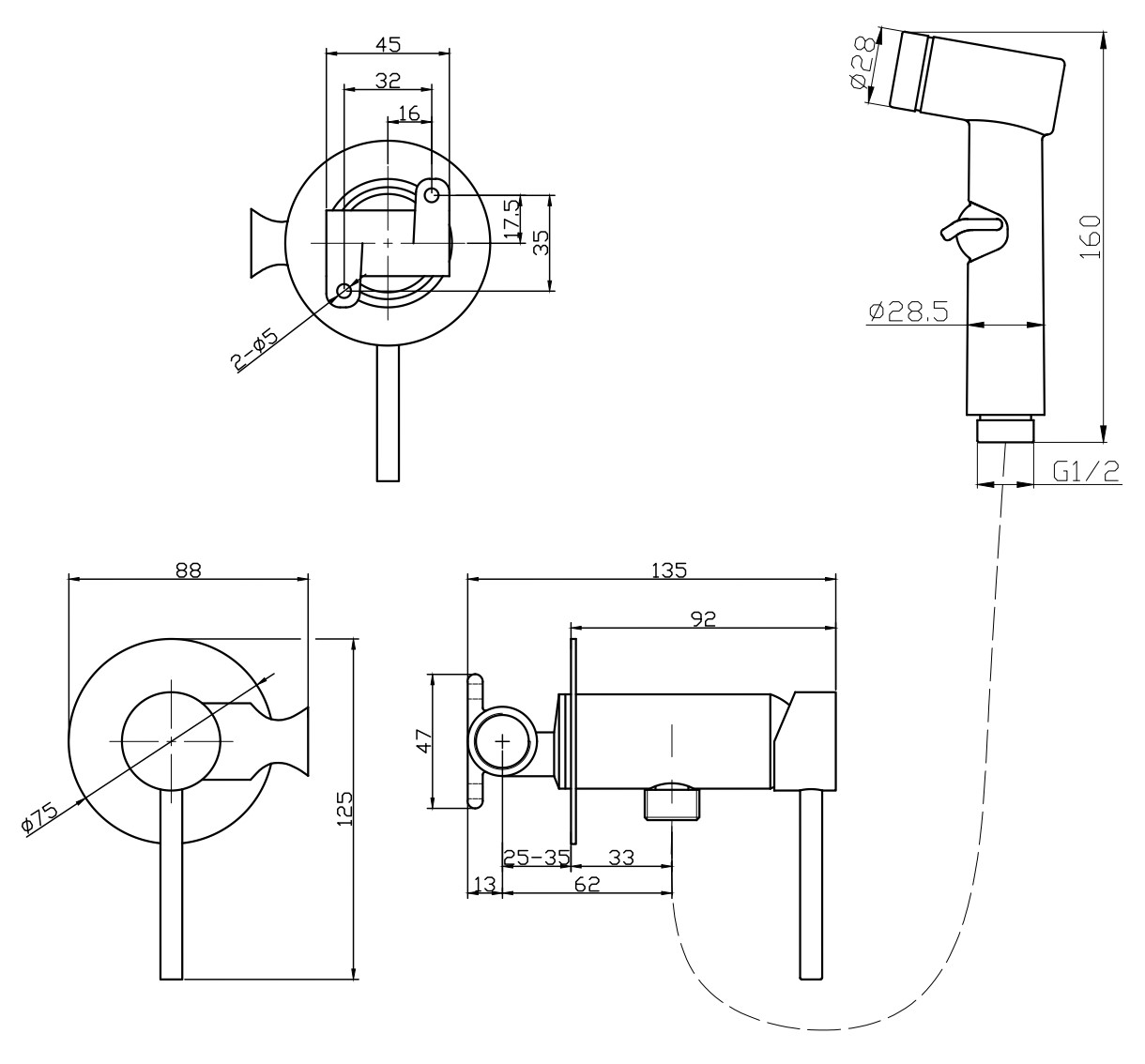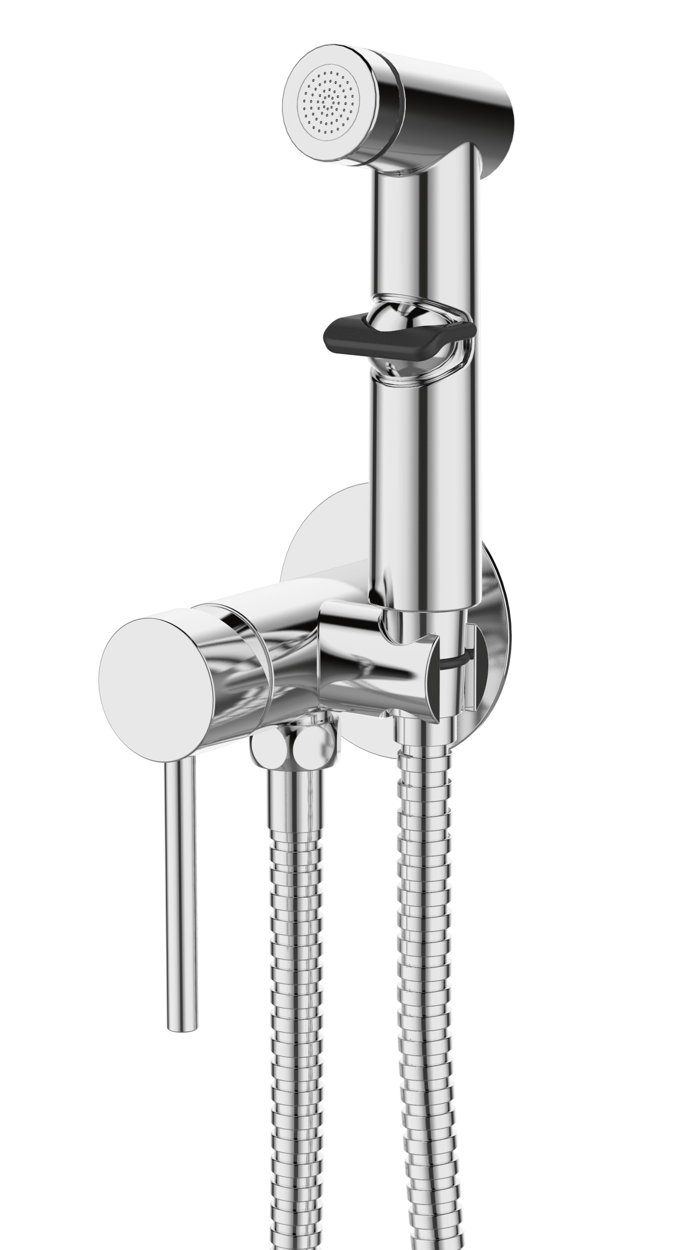 В комплекте: гиг. лейка, металлический держатель, пластиковая вставка держателя, шланг, металлический отражатель, штуцер на шланг, шестигранник,онтажный комплект