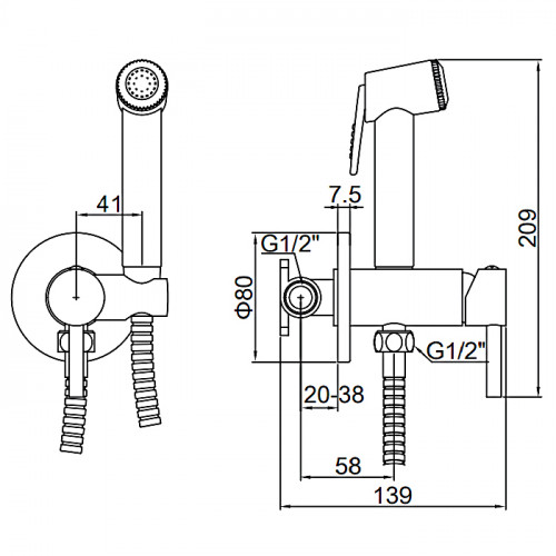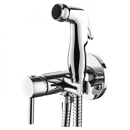 Смеситель изготовлен из хромированной латуни, включение подачи воды с помощью керамической кран-буксы, подключение к магистрали холодной воды жесткое, в комплекте шланг длиной 1,5 метра, лейка для биде, настенное крепление лейки, декоративный отражатель.