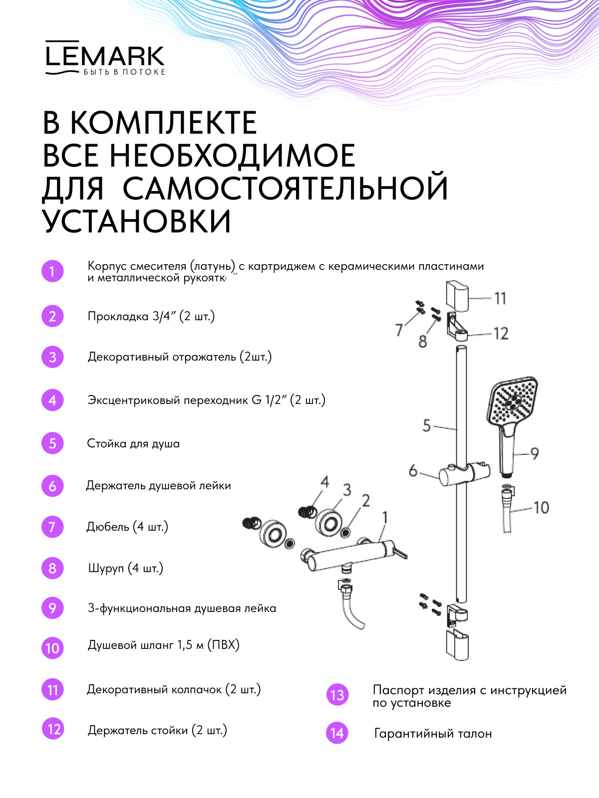 Аксессуары в комплекте: 3-функциональная лейка 252?116 мм, регулируемое по высоте крепление для лейки, душевой шланг 1,5 м (ПВХ)