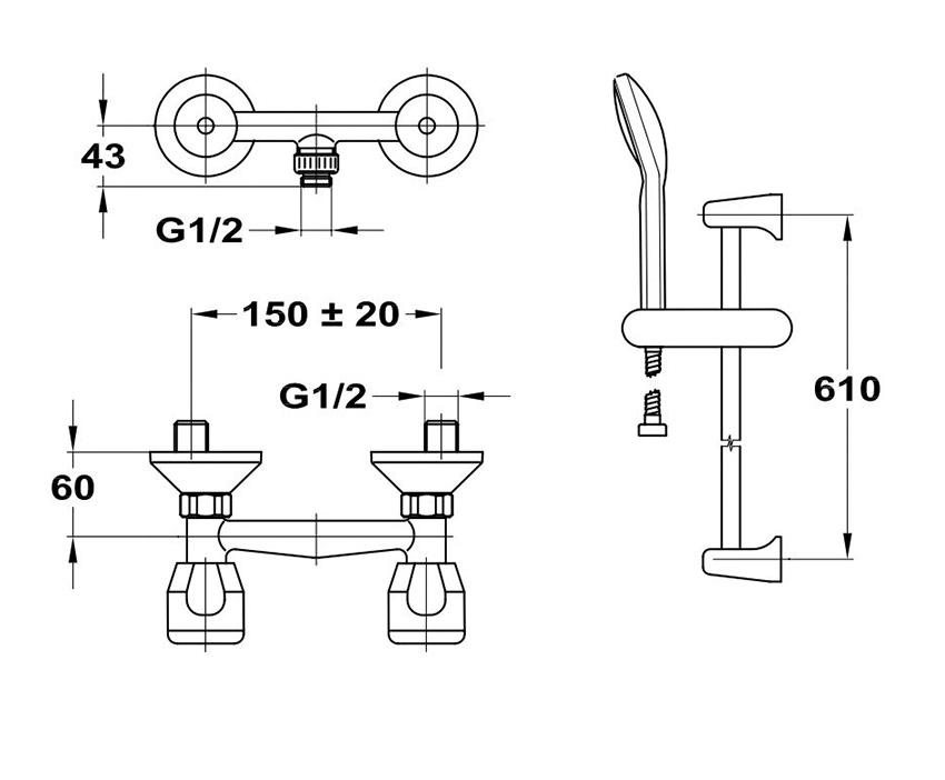 В комплекте шланг 1,5 м., ручной душ и кронштейн.