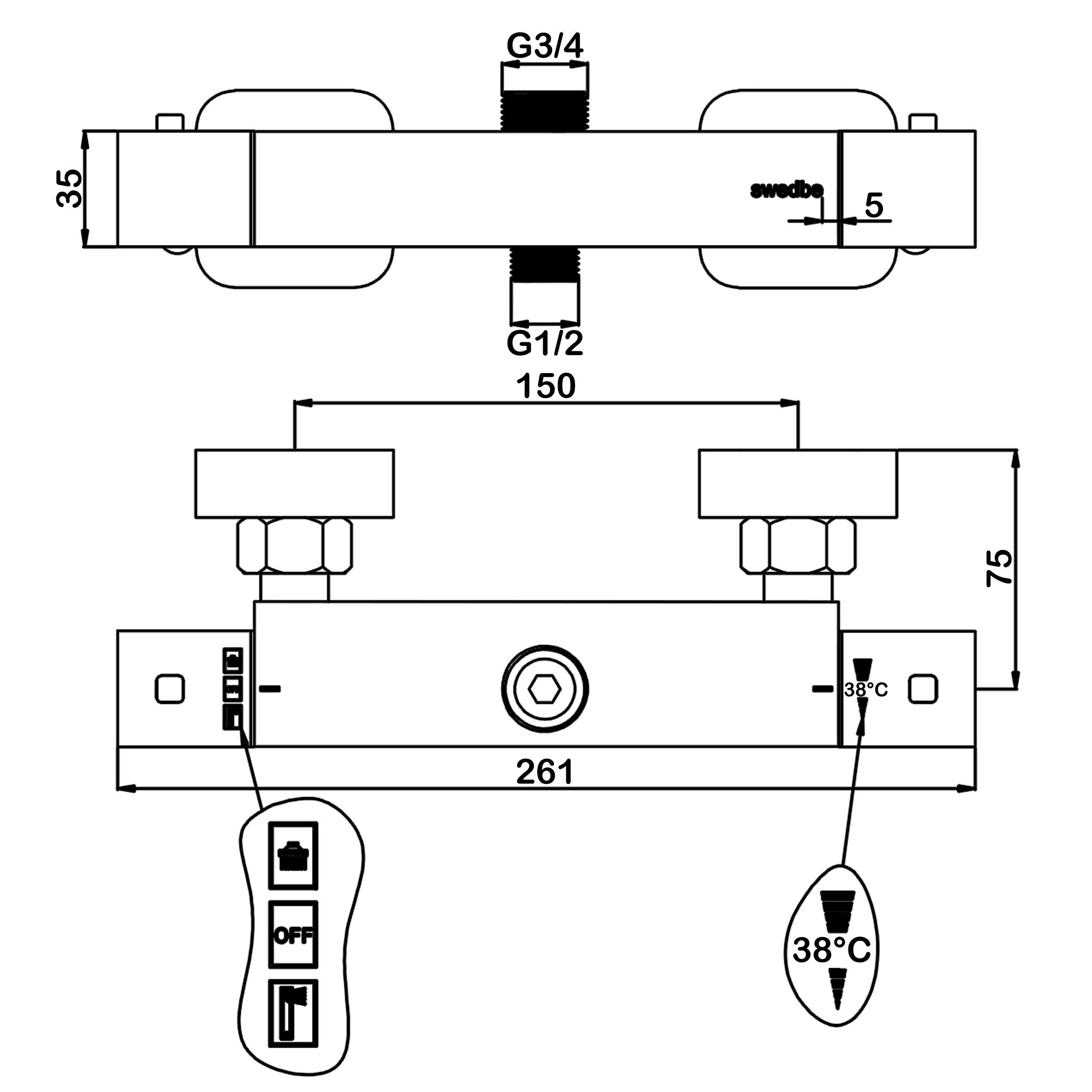 Смеситель для душа Swedbe Hermes термостат, с верхним подключением хром (9023)