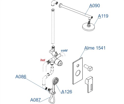 Состав поставки: Смеситель для ванны и душа Alme 1541, подключение шланга A086, шланг для душа 1500 мм А087, верхняя душевая насадка A119, верхний излив для душа A090, лейка 3-функциональная A126