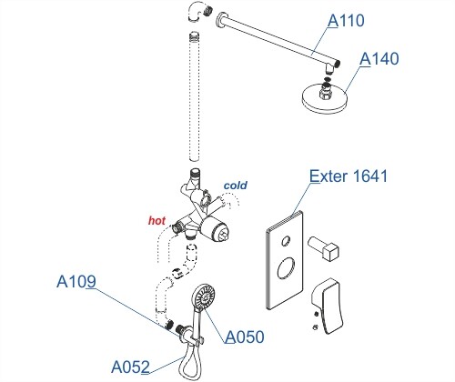 Состав поставки: cмеситель для ванны и душа Exter 1641, подключение шланга A109, шланг для душа 1500 мм А052, верхняя душевая насадка A140, верхний излив для душа A110, лейка 3-функциональная A050