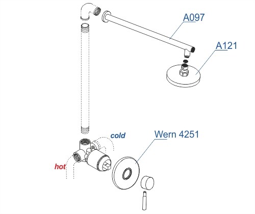 Состав поставки: смеситель для душа Wern 4251, верхняя душевая насадка A121, верхний излив для душа A097