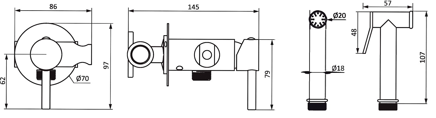 - Эстетика в функциональном обрамлении: компактный смеситель с настенной установкой экономит пространство, стильная ручка-стик удобна в управлении, а гигиенический душ с держателем позаботится о полноценной чистоте.