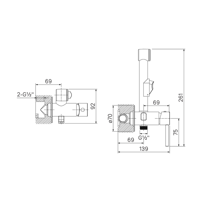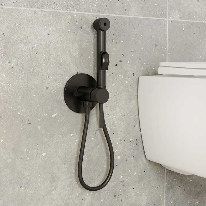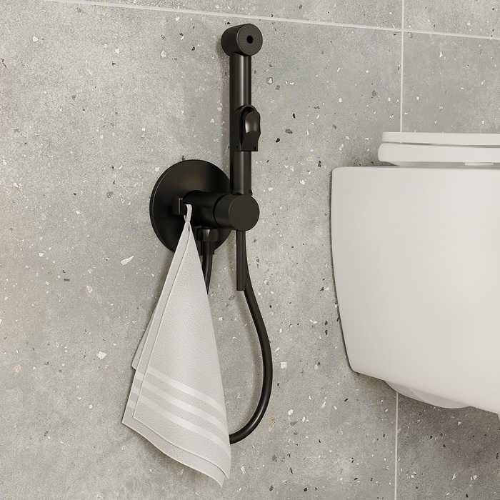 Встраиваемый смеситель с гигиеническим душем и крючком для полотенца,матовый черный, однозахватный, латунь, керамический картридж Softap.