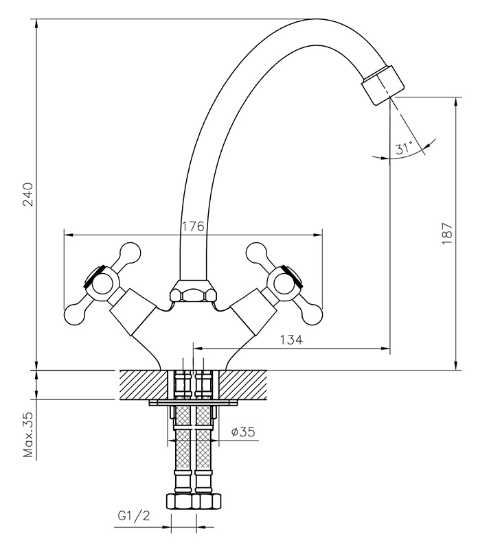 Смеситель для кухни с поворотным изливом, вентильный, высота излива 19 см, длина 13 см, хром