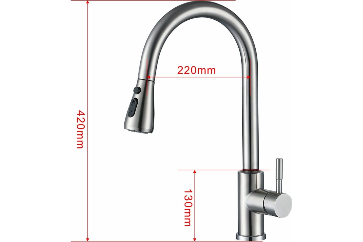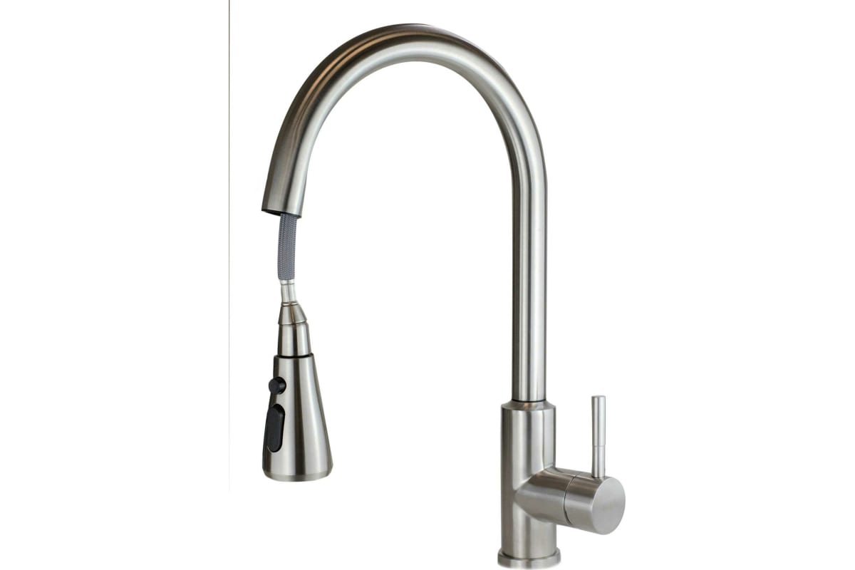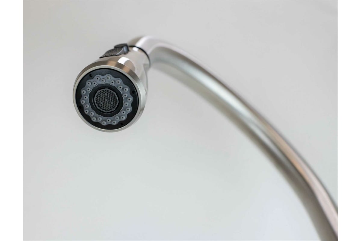 Корпус: нержавеющая сталь, марка SUS 304 (пищевая сталь),кнопочное переключение режимов "лейка - аэратор", кнопка прерывания потока.