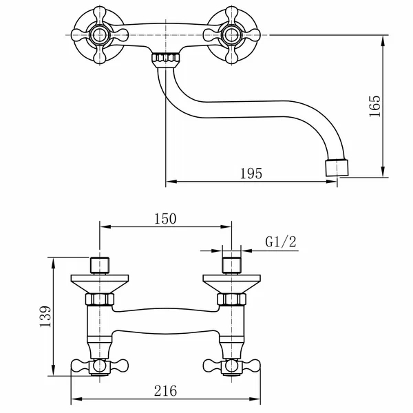A4608 смеситель настенный для кухонной мойки/умывальника хром латунь кранбуксы с керамическими пластинами 90° излив: L=195 мм, поворотный установочный комплект + упаковка: картонная коробка