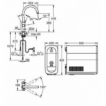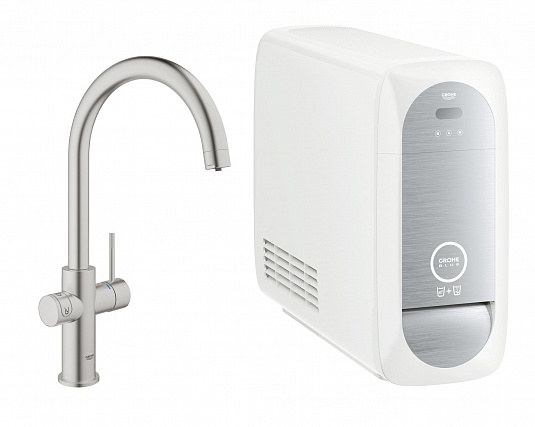 GROHE Blue Home Стартовый комплект включает в себя: GROHE Blue Home Смеситель однорычажный для мойки с функцией очистки водопроводной воды отдельная рукоятка для 2х видов фильтрованной и охлажденной столовой воды негазированная и газированная C-излив отдельные водотоки для питьевой и водопроводной воды гибкая подводка GROHE Blue Home охладитель-карбонизатор Охладитель-карбонизатор 270 Вт, 230 V, 50 Hz обеспечивает 5 л охлажденной воды в час регулируется для фильтров GROHE Blue размер S, GROHE Blue на основе активированного угля и GROHE Blue Магний+ Одобрено в СE GROHE Blue фильтр размер S, головка для фильтра с настройкой уровня жесткости воды GROHE Blue® 425 гр. баллон с углекислым газом (CO2).