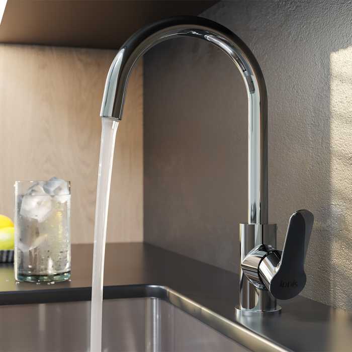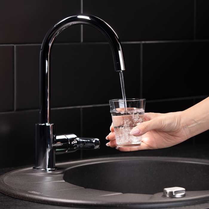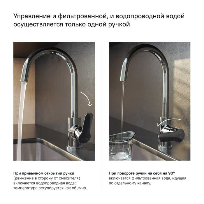 - Теперь, чтобы налить стакан чистой воды, не нужна вторая ручка, — достаточно просто повернуть основную ручку в закрытом состоянии. Встроенный отдельный канал для фильтрованной воды позволяет, при подключении к любому фильтру, наслаждаться чистой питьевой водой прямо из смесителя. Нет необходимости устанавливать отдельный смеситель и сверлить под него отверстие.
