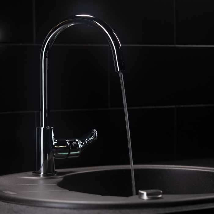 - Высокий поворотный излив делает смеситель более практичным.