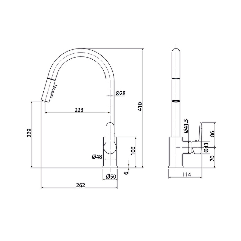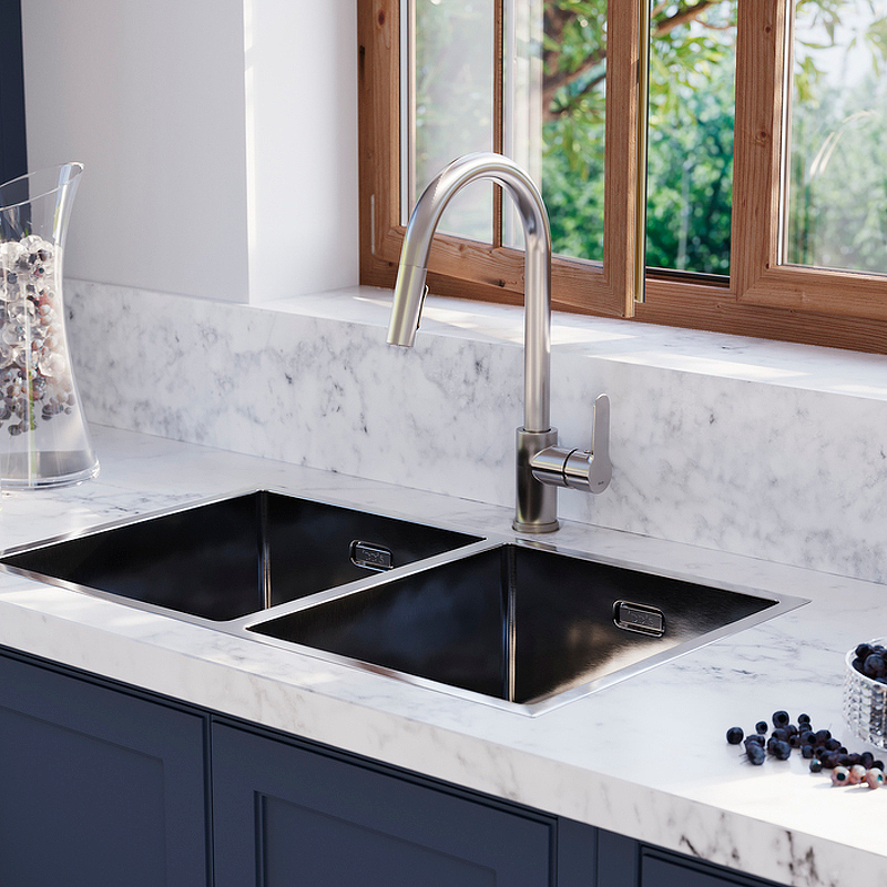 Смеситель для кухни, однозахватный, материал - нержавеющая сталь, цвет -сатин. Выдвижной излив. Гибкая подводка 50 см, упаковка -цветная картонная коробка, текстильный мешок. 2 режима струи