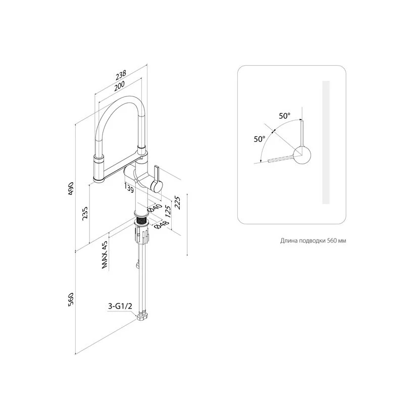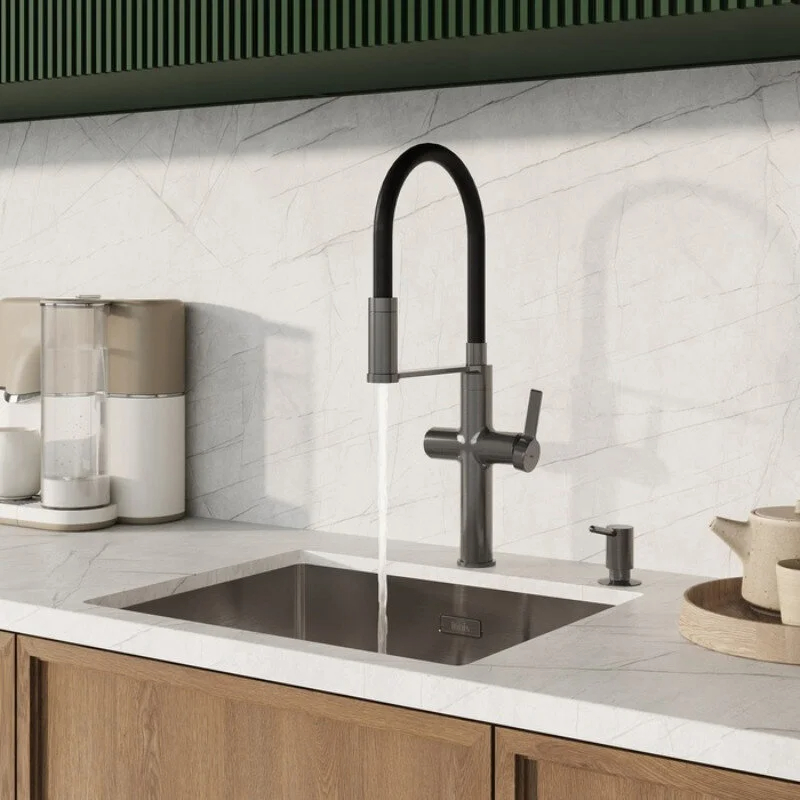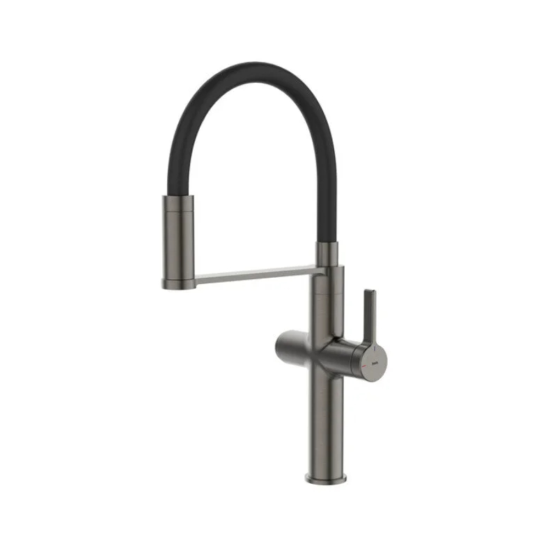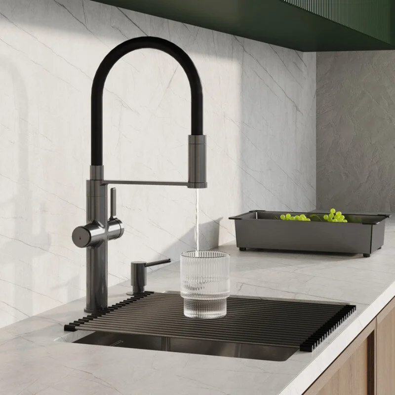 Смеситель для кухни c каналом для фильтрованной воды и гибким изливом, однозахватный, латунь, цвет - графит, керамический картридж колд-старт 30 мм с функцией подачи фильтрованной воды, двухрежимный пластиковый аэратор Neoperl М28 с дополнительным каналом для питьевой воды. Смеситель управляется с использованием ручки и кнопки для подачи фильтрованной воды. В комплекте: гибкая подводка 600мм., крепеж с технологией i-loosen, ключ для аэратора, ключи для гибкой подводки. Упаковка - картонная коробка, ложемент из вспененного полиэтилена.