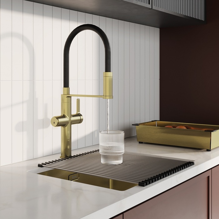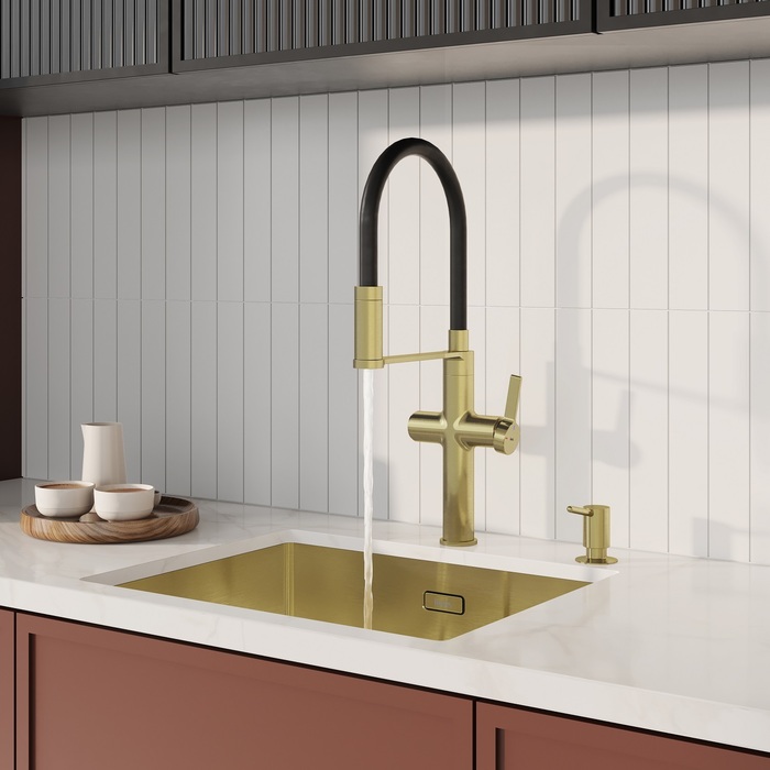 Смеситель для кухни c каналом для фильтрованной воды и гибким изливом, однозахватный, латунь, цвет - матовое золото, керамический картридж колд-старт 30 мм с функцией подачи фильтрованной воды, двухрежимный пластиковый аэратор Neoperl М28 с дополнительным каналом для питьевой воды. Смеситель управляется с использованием ручки и кнопки для подачи фильтрованной воды. В комплекте: гибкая подводка 600мм., крепеж с технологией i-loosen, ключ для аэратора, ключи для гибкой подводки. Упаковка - картонная коробка, ложемент из вспененного полиэтилена.