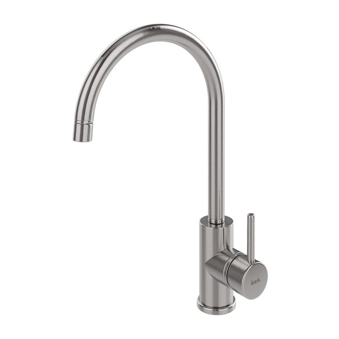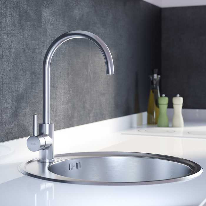 - Смеситель для кухни из нержавеющей стали Kitchen универсального дизайна подойдет практически к любому интерьеру. Благодаря высокому поворотному изливу будет удобен в использовании даже с неглубокой мойкой.