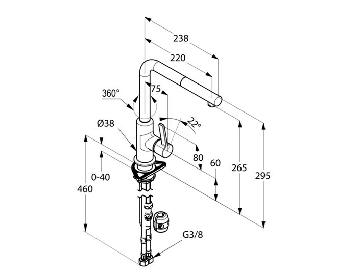Кухонный однорычажный смеситель DN 15: литой рычаг, монтаж на одно отверстие, керамический картридж, аэратор М 16 х 1, расход воды в режиме 8,2 л/мин при давлении 3 бара, поворотный, выдвижной излив, защита от обратного тока воды, гибкая подводка G 3/8, крепление на стержне.