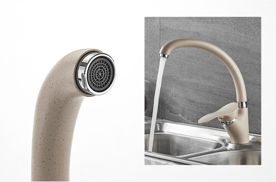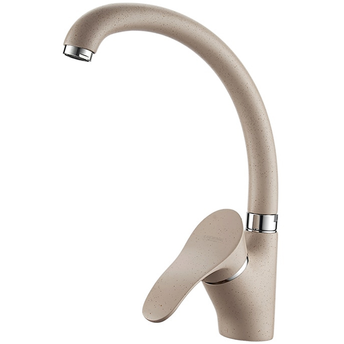 Смеситель однорычажный, с поворотным изливом, материал смесителя латунь с нанесением покрытия имитирующее гранит бежевого цвета, крепление на кухонной мойке с помощью шпилек.