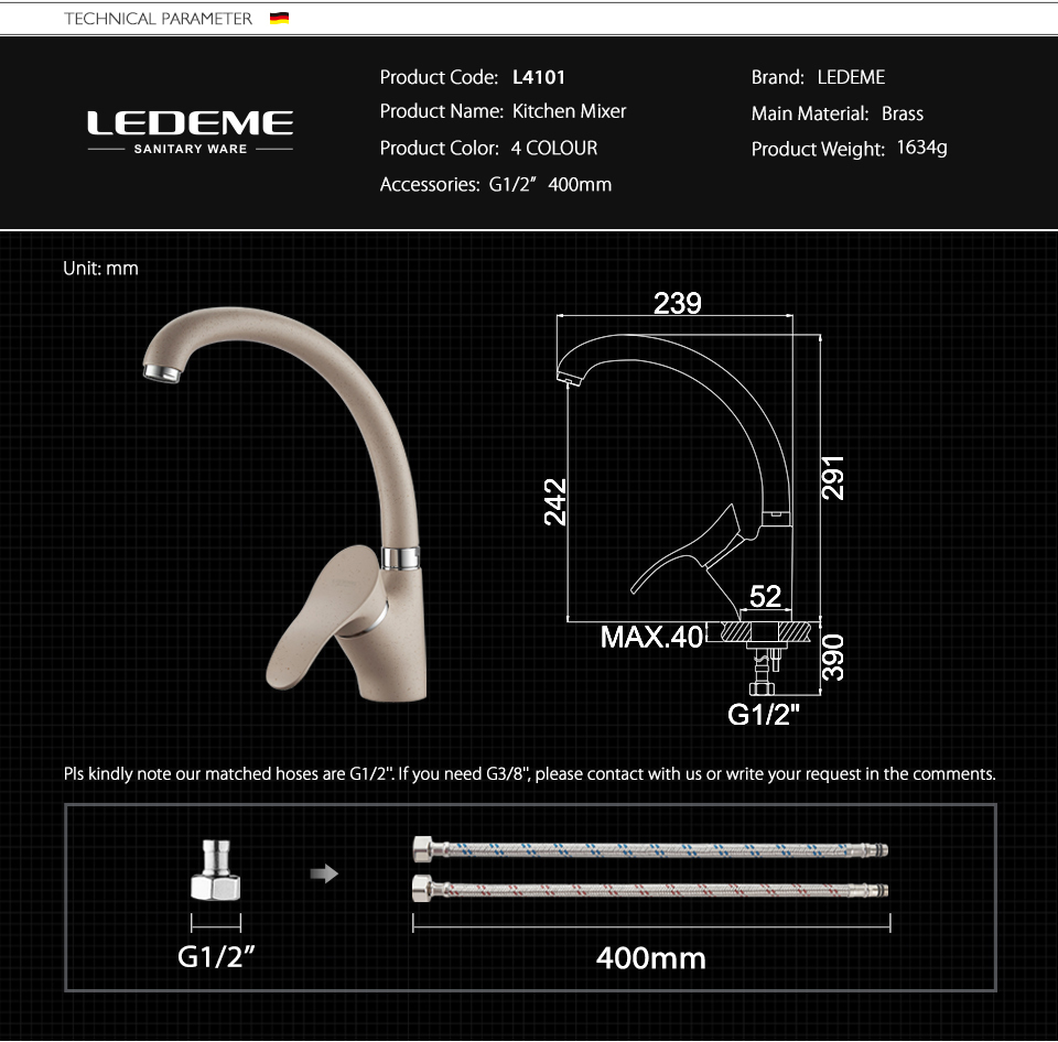 Смеситель LEDEME L4101K предназначен для использования на кухне.