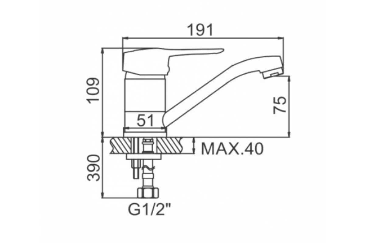 Смеситель однорычажный, крепление на кухонной мойке с помощью обжимной гайки.