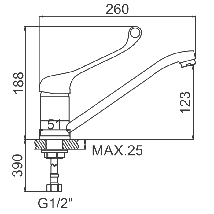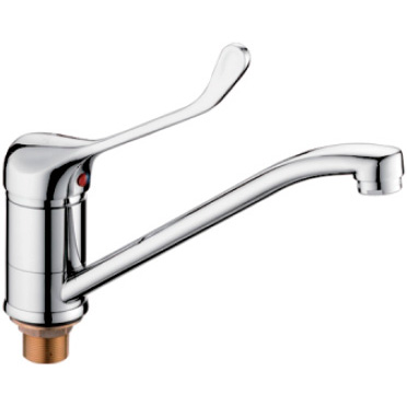 Смеситель однорычажный, с удлиненным рычагом и утолщением на его конце, для удобного открывания/закрывания с помощью локтя, крепление на умывальнике или мойке осуществляется с помощью обжимной гайки.