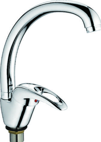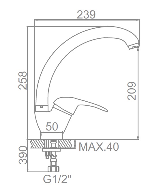Высота поворотного излива 209 мм, длина 239 мм, крепление на мойке с помощью гайки
