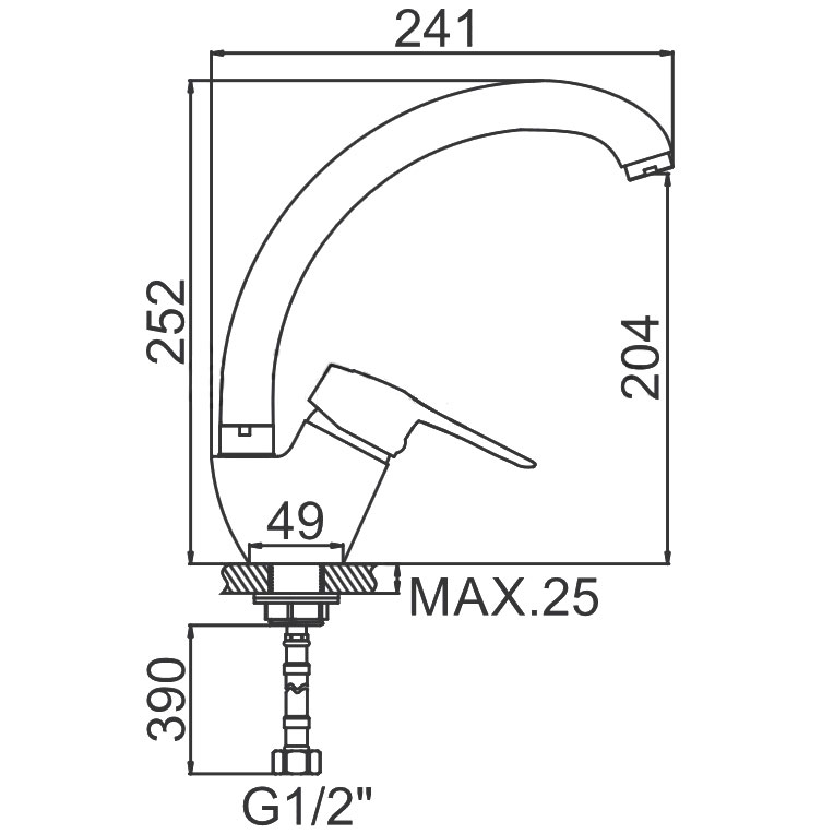 Смеситель однорычажный, с поворотным изливом, крепление на кухонной мойке с помощью обжимной гайки.