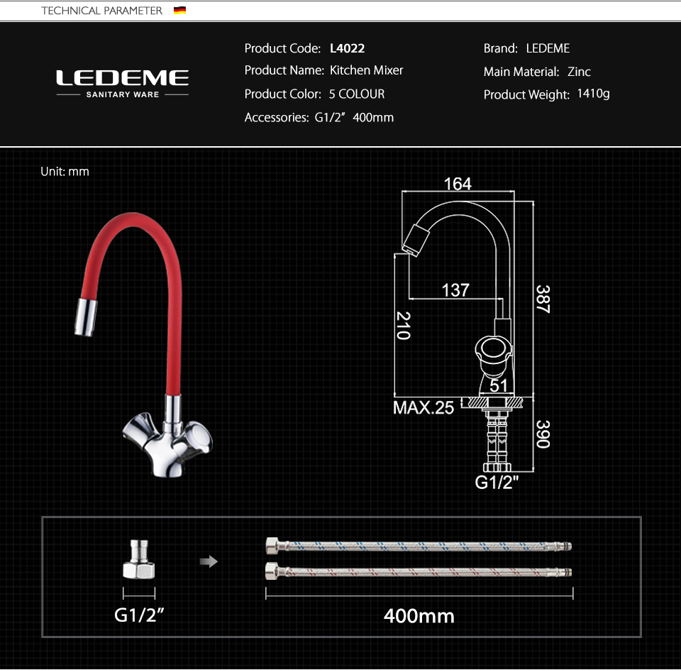 Смеситель для кухни Ledeme с гибким изливом (L4022-3)
