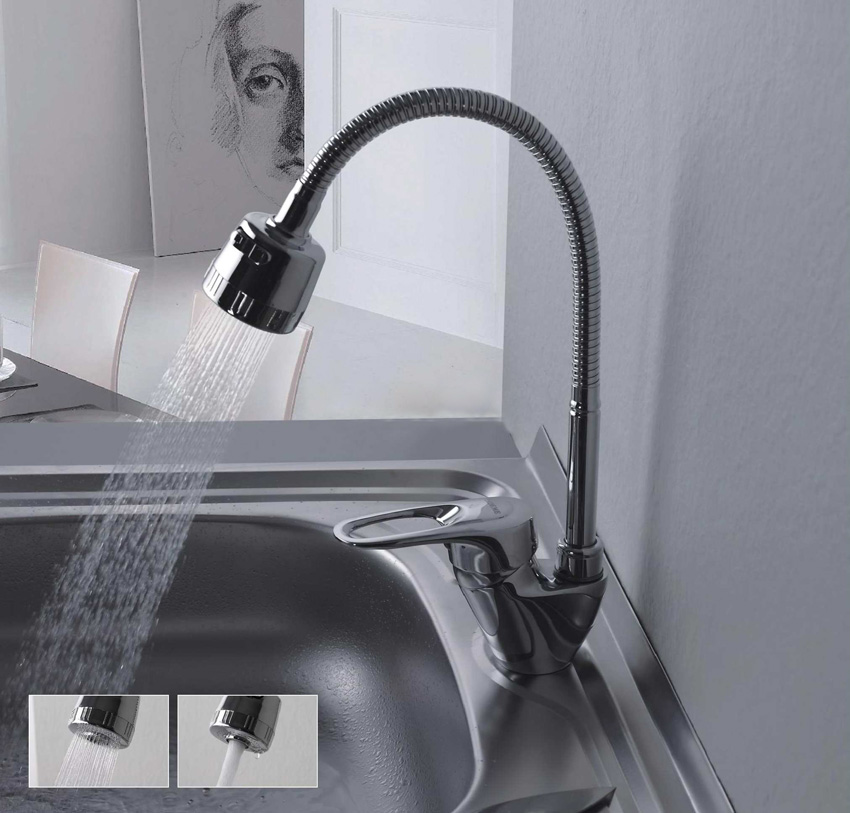 Смеситель с гибким поворотным изливом, подача воды осуществляется с помощью ручки и керамического картриджа диаметром 35 мм, поток воды может выдаваться в двух режимах.