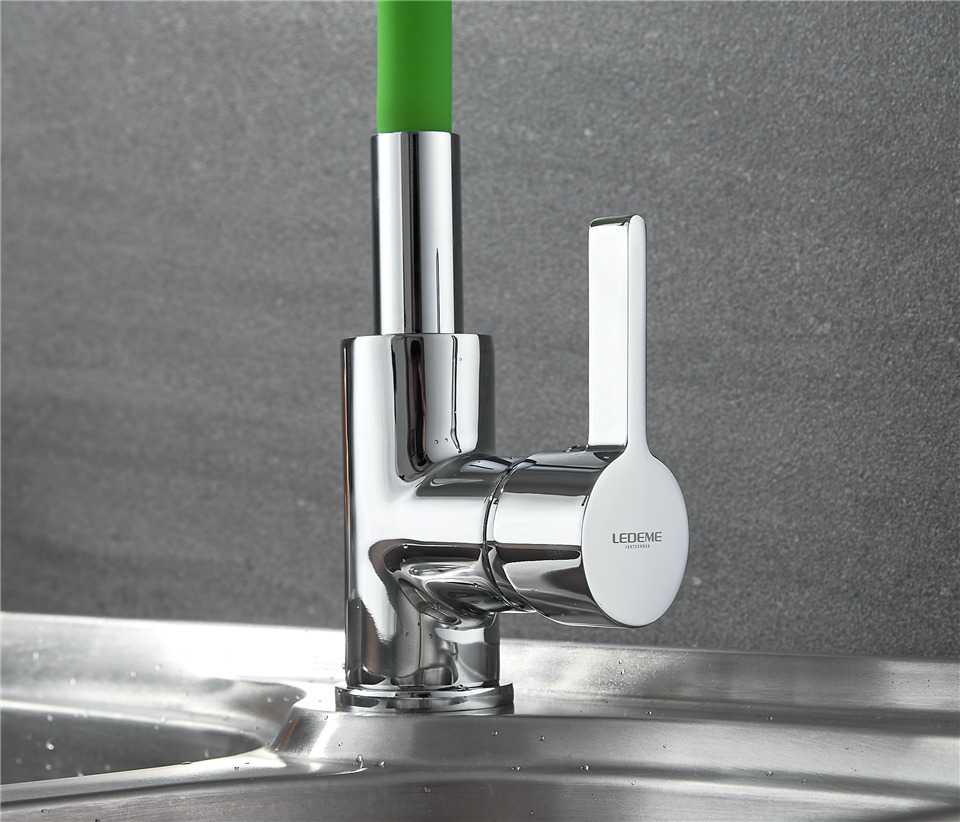 Смеситель кухня LEDEME гибкий шланг в коллекции смесителей из серии силиконовых смесителей с цветным покрытием успешно сочетаются с современным дизайном с применением необычных форм деталей.