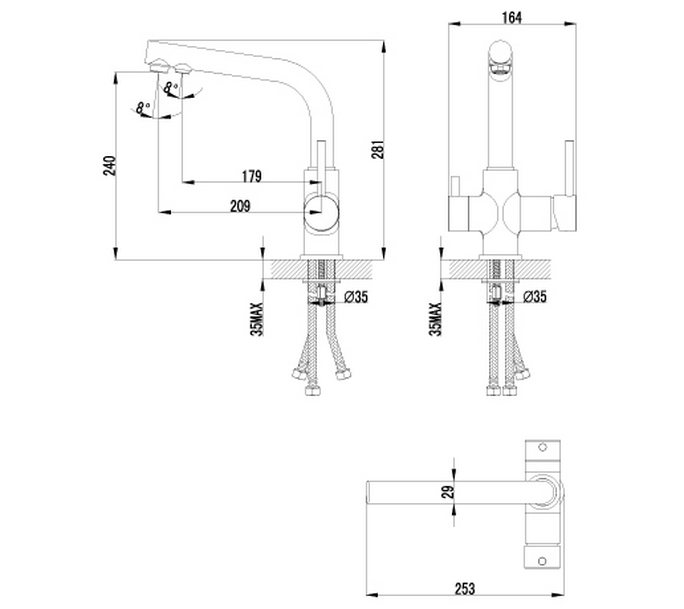 - Использование керамического картриджа 35 мм, практически бесшумно смешивающего потоки точно до заданной температуры, увеличивает срок службы оборудования.
