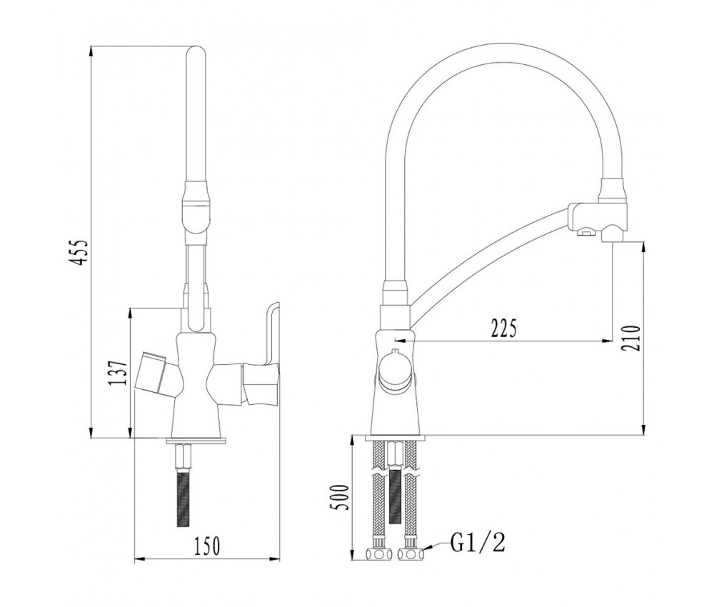 - Фиксированный излив для подачи питьевой воды дополнен гибким шлангом из силикона, который облегчит мытье посуды и уборку мойки.