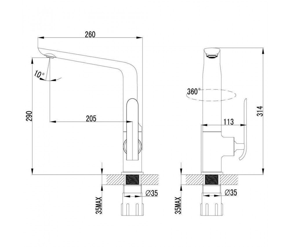 - Керамический картридж размером 35 мм подает поток, смешанный до установленной температуры, и герметично перекрывает его при выключении крана.