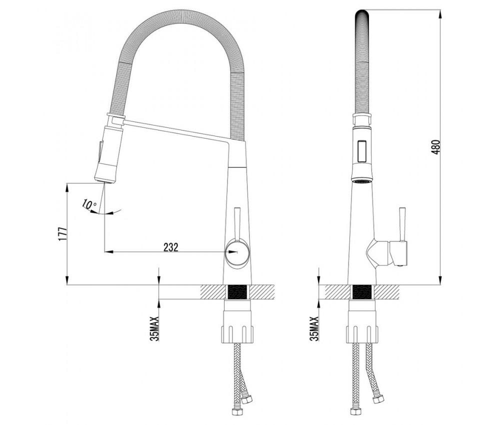 - Поворотный излив оснащен двухфункциональной лейкой с гибким шлангом.