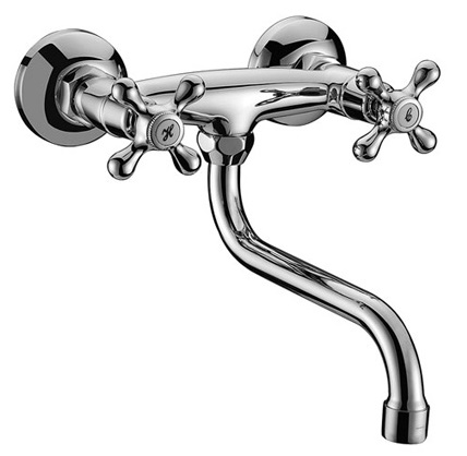 - Настенная конструкция дополнена двумя элегантными вентилями и поворотным изливом для удобного мытья посуды.